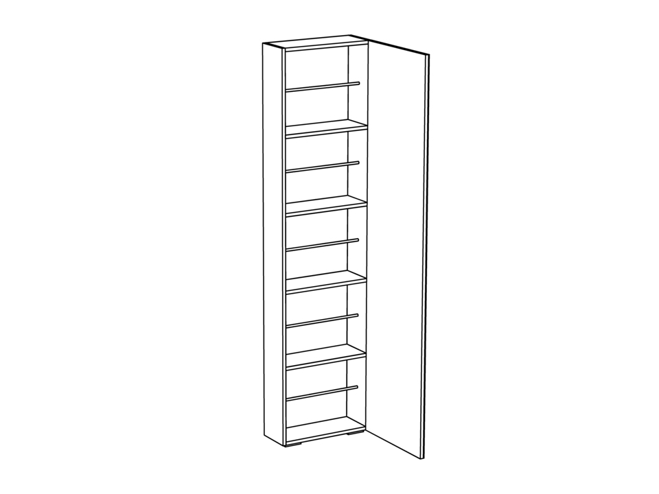 Шкаф для обуви с зеркальным фасадом. Дверь открывается по принципу «нажал-открыл». В шкафу пять отделений для хранения обуви. Шкаф установлен на регулируемые опоры и крепится к стене.