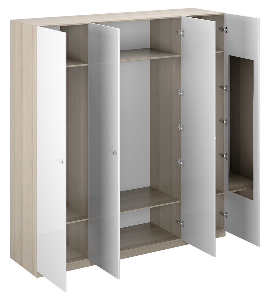 Шкаф четырехдверный состоит их трёх отделений. В отделениях расположены верхние стационарные и нижние съемными полки. На одной дверце шкафа с внутренней стороны расположено зеркало. Шкаф установлен на регулируемые опоры. Данную мебель рекомендуется крепить к стене.